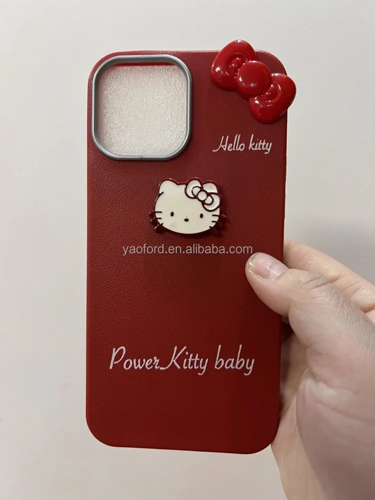 Red Bow Kt Cat Leather Texture Case iPhone 15 14 13